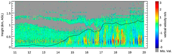 Vertical wind velocity measured by CWAL. The positive and negative values represent upward and downward motion, respectively. The solid black line indicates the PBL heights obtained based on the backscatter profile of CWAL.