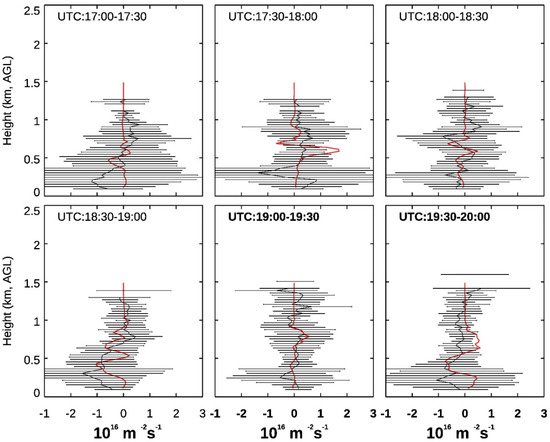We calculated the observed ozone turbulent flux (solid black line) with statistical errors at each level (horizontal black line) every 30 min from 1700–200 UTC (shown in Figure 8), as well as the simulated ozone turbulent flux (solid red line). It is evident that the spatial and temporal resolutions of ozone DIAL and CWAL are not fine enough to capture the ozone flux caused by small eddies (with lengths less than the measurement resolution). Consequently, ozone flux may be underestimated. However, the ignored portion of the ozone flux should be negligible in the CBL. The unresolved part of the ozone flux cannot be quantified since there is no high resolution in situ measurement on both ozone and wind with for comparison with the measurements by ground-based remote-sensing techniques [65].
