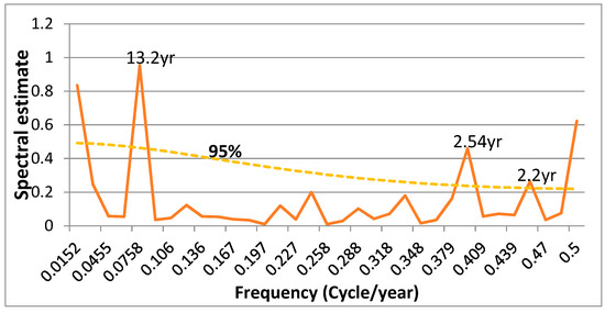 The power spectrum of the LST time series was computed using the autocorrelation spectral analysis method [36,37], and tested using Markov red noise theory and 2-tests [38]. The linear graphs of LST highlight the persistent alternating periods between the anomalies. Through the analysis of periodic behavior, a spectral analysis of the variance of these time series can provide more detailed information. Figure 3 clearly demonstrates peaks at periods of about 2.2, 2.54, and 13.2 years, which are significant at the 95% confidence level. From the spectral analysis, one can suppose that LST was described by non-periodic behavior. In this study, some explanations of the periodicities stated above are presented.
