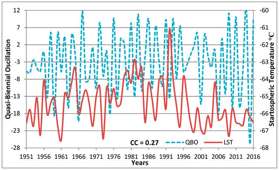 This study has shown that the quasi-biennial oscillation may affect LST. The findings of [44] showed that the quasi-biennial oscillation normally operates with a periodicity of 26 to 30 months. In addition, [45] found that the periodicity of the quasi-biennial oscillation was approximately 28 months in the lower stratosphere. Anstey et al. [46] argued that the periodicity of the quasi-biennial oscillation varies from approximately 22 to 36 months. The periodicity of the quasi-biennial oscillation averages approximately 28 months [29], but is known to have interannual variations of several months, [45]; however, the quasi-biennial oscillation could be affected by solar cycles [47] and by the propagating planetary waves into the stratosphere [13]. Figure 4 illustrates the distribution pattern of the quasi-biennial oscillation and LST time series. Also, cross-correlation coefficient lead–lag between two time series is represented in Figure 4. From this Figure, it is easily observed that significant cross-correlations (0.27) at the 95% level are spotted at lag 1 of the quasi-biennial oscillation. Therefore, the LST may be affected by previous quasi-biennial oscillations.