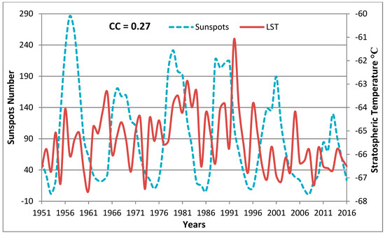 Kuai et al.; Haigh [48,49] found that the sunspot cycle is a significant contributor to stratospheric variability. The length of the solar cycle has varied between 9 and 13 years [50]. Between two solar minima, the sunspot cycle’s interval may be as short as 9 years and up to 14 years (https://scied.ucar.edu/sunspot-cycle). Figure 5 shows the time series of the sunspot number and LST. It is obvious from this figure that the cross-correlation coefficient between sunspot number and LST is 0.27 at zero lag; therefore, the number of sunspots may affect the LST in the winter season. Crooks and Gray [21] found the same results when studying the effects of the sunspot cycle and quasi-biennial oscillation on the polar vortex.