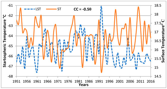 This study examines the lower stratospheric temperature (LST) and the relationship between surface air temperature and lower stratospheric temperature over the Arabian Peninsula. In 1982 and 1992, the maximum LST was observed, which could be related to volcanic eruptions. Numerous studies, such as [81,82,83], demonstrate the influence of volcanic eruptions on the temperatures of the lower stratosphere and Earth’s surface. These studies found that lower stratospheric warming and surface cooling occurred after a volcanic eruption. According to the linear trend, an insignificant downward cooling (−0.01 °C/year) through the period between 1951 and 2016 was found. The time series of the LST over the entire period was divided into two phases: the first one was from 1951 to 1992 and the second one was from 1993 to 2016. In the period between 1951 and 1992, there was an insignificant increasing linear trend (0.05 °C/year) in the LST, whereas in the period between 1993 and 2016, there was an insignificant decreasing linear trend (−0.05 °C/year). From the coefficient of variability (COV) method, the average value of the LST tends to increase. The mean values through the reference periods (1961–1990, 1971–2000, and 1981–2010) were more dependable due to the low value of the COV (−0.43, −0.42, and −0.01, respectively). Power spectrum analysis of LST time series and periodic behavior revealed peaks at 2.2, 2.54, and 13.2 years (significant at the 95% confidence level). Consequently, the quasi-biennial oscillation (2.2 and 2.54 years) and sunspots (13.2 years) may affect the LST. Correlation analysis was used to determine the relationship between the temperature of lower stratosphere and troposphere. A remarkably inverse relationship ( 99% confidence level) between LST and ST was found in the Arabian Peninsula during the winter season. Lead–lag cross-correlation was used to investigate the physical mechanisms between time series [35]. Lead–lag cross correlations between LST and the ST demonstrate that the correlation coefficient is −0.50 at zero lag. Many previous studies, e.g., [51,53,54,55,56,57], have pointed out that the stratosphere and troposphere were related to each other in wintertime. According to [2], stratospheric cooling in association with surface temperature warming is due to the role of greenhouse gases.
