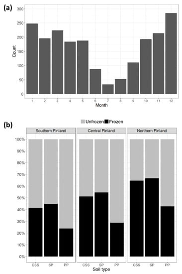 31] for the calculation of soil temperatures in three common combinations of soil and forest types in Finland, i.e., dense Norway spruce stands on clay or silt soil, Scots pine stands on sandy soil, and Scots pine stands on drained peatlands. Soil frost conditions can vary a lot, even up to few months in mean duration, depending on soil type. Peat is effective insulator compared to mineral soils, therefore having shorter soil frost periods in similar climatic conditions [