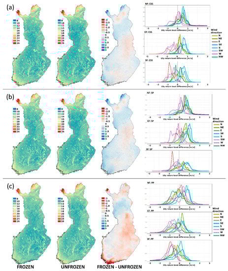 Figure 4b maps), of which results as a whole resemble each other closely with similar spatial patterns and direction of differences. On large scale, larger differences were observed for CSS and SP only in parts of northernmost Finland and in the coastal are of southwestern Finland, i.e., maximum 10-year return level of wind speed was about 1–2 m/s larger in soil frost season. Differences larger than +/−1 m/s were a bit more common for PP (