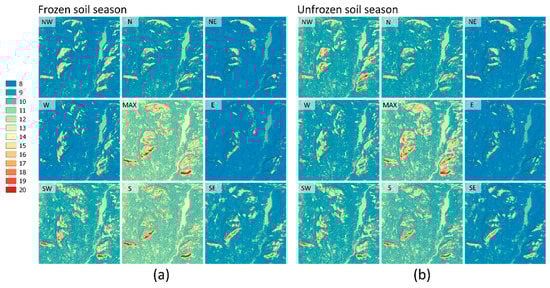 Figure 6, middle). In this example case, stronger winds occurred during soil frost season, but there were also areas, mainly northwestern hillsides, where the situation was opposite.