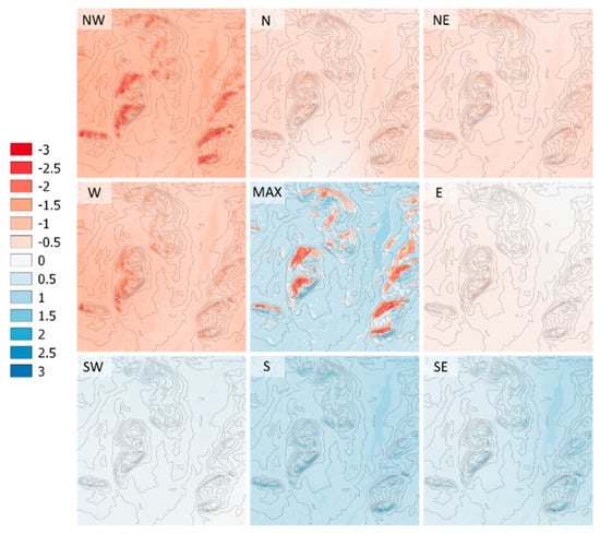 41] for boreal forest conditions. In this study, only topographic and terrain (surface roughness) properties are taken into account when assessing local maximum wind speeds (and their return levels) separately for the eight cardinal and intercardinal wind directions. For the application in forested landscapes, the shielding factor, i.e., the effect of upwind buildings providing cover to the place of interest and only relevant in urban areas, was not considered. The wind multiplier method has been presented earlier in [