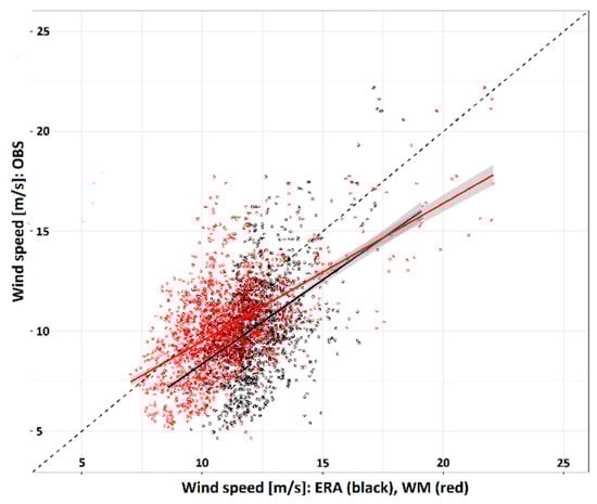 Figure 7 show that even if there is still large variability and some systematic biases, the majority of the OBS and WM comparisons are closer to 1:1 line than the corresponding OBS and ERA comparisons. Also in