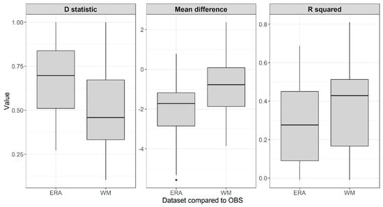 Figure 8, all three statistics show improvement when comparing differences between OBS and WM to differences between OBS and ERA. Taken over all the comparisons, the D statistic of two-sample Kolmogorov–Smirnov test is decreasing from 0.543 to 0.195, R