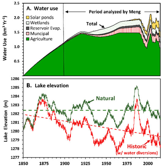 Meng [1] highlights extreme weather events, which he suggests support an extremely changing point analysis of “the so-called current declines of the world’s saline lakes”. He describes “extreme weather events” as those that are more that ±2 S.D. of the mean. Meng [1] is correct that periods of extreme precipitation or drought cause large changes in runoff and the level of Great Salt Lake. This is true for all closed-basin lakes (e.g., Lake Abert—[9]; Lake Urmia—[3]). For example, above average precipitation in the Great Salt Lake watershed from 1967–1981 increased the lake level by 2.0 m and then back-to-back 100-year precipitation events of 1982 and 1983 increased the lake level by another 2.4 m. This phenomenal increase, however, was followed by a 5.0 m decrease from 1987 to 2016, when the lake reached its lowest recorded level of 1277.5 m [18]. Meng incorrectly indicated that the lake’s lowest level was in 1963 because he failed to calculate changes in both the north and south arms of the lake that are divided by a causeway [38]. Meng’s analysis highlights the importance of weather-induced changes in the quasi-cyclic elevations of saline lakes, but without conducting a careful water balance analysis, he failed to identify the more important long-term driver of change in most saline lakes: persistent water withdrawals from their tributaries for agricultural and other forms of evaporative consumption [2,5,6,7,8,9,10,12,18,39,40].