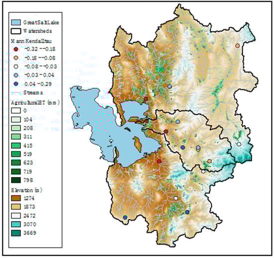 Additional analyses show that when all long-term and active stream gages in the Great Salt Lake watershed are considered, Meng’s [1] assertion that decreasing precipitation is reducing streamflows is erroneous (Figure 2). In low order headwater streams above agricultural diversions, streamflow is stable. In contrast, in higher order rivers proximal to irrigated agricultural areas, streamflow decreases are observed. Indeed, such a pattern is a telltale sign of increasing agricultural water consumption over time [5]. As of 2015, GSL had shrunk by 2874 km2 from 5966 km2 [35]. In the Great Salt Lake watershed, 3894 km2 of agricultural land is irrigated [36]. MODerate resolution Imaging Spectroradiometer (MODIS)-derived annual evapotranspiration (ET) for irrigated areas in the GSL watershed suggest mean ET is 370 mm∙yr−1 [37], implying an annual consumption of water for irrigated agriculture in the GSL basin of 1.5 × 109 m3∙yr−1, similar to the estimate by [18]. If evaporation excess (evaporation—direct precipitation) from the lake’s surface is 0.61 m∙yr−1 on average [22], then approximately 2500 km2 of the reduced lake area can be attributed to irrigated agriculture, over 85% of the observed lake area loss.