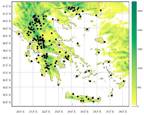 The Greek terrain is characterized by strong horizontal and vertical partitioning and gradients. The western part of the mainland is mountainous with only a few plains. Most of the plains in Greece can be found in the eastern part of the country, which also borders with the coastline. According to Flocas [14], the low (0–200 m) and semi-low (201–500 m) areas correspond to 32.8% and 26.0% of the total area, respectively, while the semi-mountainous and mountainous areas correspond to 27.8% and 9.9%, respectively, of the total area. The remaining 3.5% is divided between the sub-alpine (1501–2000 m) and the alpine (higher than 2000 m) areas. The mainland covers about 80% of the total area of the country; the remaining 20% is shared among about 6000 islands and islets. The land is dry and rocky, with just 20% of it being suitable for cultivation. The peak elevation is 2904 m. The Greek climate is typical Mediterranean with mild and rainy winters, relatively warm and dry summers, and extended periods of sunshine throughout most of the year (http://climatlas.hnms.gr/sdi/?lang=EN).