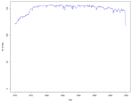 The selection of the stations was determined by the following requirements: (a) they have less than 30% of missing data on monthly time series during the examined period and (b) they are distributed over the lowlands, semi-mountainous, and mountainous areas of mainland and islands covering almost all climatic zones of Greece. Precipitation in the two networks is measured using rain gauges, usually an open receptacle with vertical sides in the shape of a right cylinder. Furthermore, the World Meteorological Organization’s (WMO) recommendation is applied whereby the monthly precipitation value is only calculated if all daily observations are available or if any missing days are incorporated in an observation accumulated over the period of missing data on the day when observations resume [15]. The locations of the 157 stations used are shown in Figure 1 and the total number of available monthly precipitation data series per year is given in Figure 2.