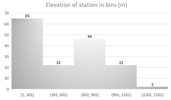 The relative advantage of the PPC observation network and the value that it added to the production of a precipitation atlas are that most of the PPC stations are located at high elevation (mountainous) and thus provide insight into the vertical distribution of precipitation amounts throughout Greece. A histogram of the elevation distribution of the stations that were used is given in Figure 3. The number and variety of stations used provided the necessary background to proceed with the application of a method to produce, for the first time, a high-resolution gridded precipitation climatological data set for Greece.