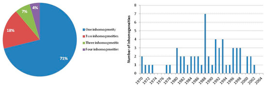 According to the homogenization results, inhomogeneities were found at 29% of the stations; 71% of the inhomogeneous stations had only one break point, 18% had two breaks, and 11% had three or four breaks. Figure 4 (left) shows the percentage of inhomogeneous stations, and 65% of the break points were accumulated between 1980 and 1995. This may be explained by the fact that HNMS’s weather station network was upgraded during this period due to aviation needs. In Figure 4 (right), the distribution of break points per year is given.