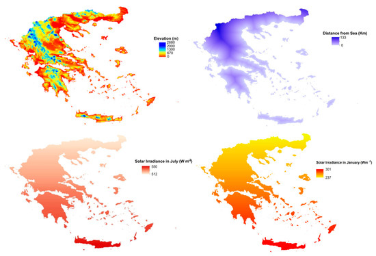 Mamara et al. [13] presented the main geophysical and topographical parameters that affect climate and investigated the potential of using only the elevation and these 15 AURELHY PCs as predicators. However, it was found that in Mediterranean countries with large sea coverage, the use of the elevation and the AURELHY variables alone is inadequate. Thus, additional topographical and geographical variables should be taken into account and it was proposed that latitude, land-to-sea percentage, distance from the sea, and the theoretical value of the incoming solar irradiance should be used since they are all considered primary drivers of atmospheric processes. In Figure 5, a geographical representation of three of the main geophysical parameters (elevation (m), Euclidean distance from the coastline (km), and solar irradiance (W/m2)) are given. The latter field was calculated on a monthly basis due to the variability in its values, and the respected maps for two months (January and July) are also given in Figure 5. All the geographic parameters (except for the land-to-sea percentage) were calculated within an 800 m radius with a spatial resolution of 0.5’ (0.008333°). This resolution corresponded to a range from 689 m (at 42° N) to 769 m (at 34° N).
