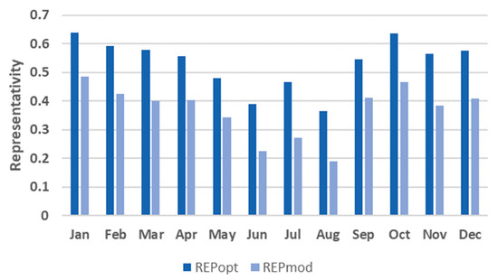 Mean monthly representativity values for monthly mean precipitation. REPopt denotes the interpolation with optimum parameters and REPmod represents interpolation with modelled parameters.