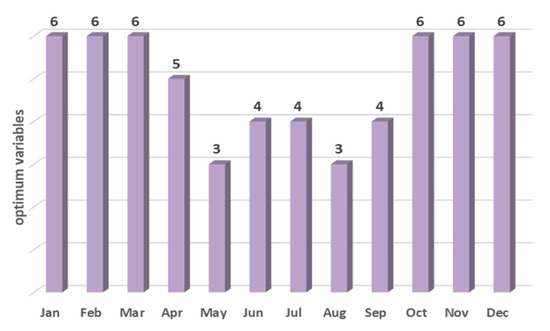 Figure 7 presents the number of optimum geophysical variables used per month as precipitation predictors by the MISH software that resulted from the modelling phase, while Table 1 shows the geophysical variables used in the linear regression model per month (PC-1 to PC-15 correspond to the first 15 AURELHY PCs). As indicated in Table 1, the linear regression models from October to April use five or six geophysical variables as precipitation predictors, while from May to September they make use of fewer geophysical variables. Elevation was used as an independent variable in all 12 linear regressions, revealing the strong relationship between precipitation and altitude, while the land-to-sea percentage were taken into account for the period from April to November. The second principal component (PC-2), corresponding to east-west slopes, seems to affect precipitation mainly during the wet season (from October to April).