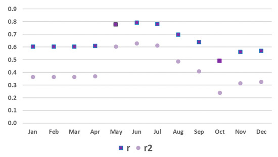Monthly correlation coefficients (r) and coefficients of determination (r2).