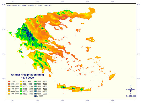 In general, the monthly and annual spatial distributions of precipitation that resulted from the interpolation module were in agreement with previous climate studies (e.g., [37,38,39]). However, more detailed patterns are evident with this analysis. The rain shadow effect of the mountain chain of Pindos upon the mainland and of the mountains of the Peloponnese is evident in Figure 9, depicting the mean annual precipitation for the period 1971–2000. This effect results in higher precipitation amounts in Western Greece on the windward side of Pindos Mountains [40] and less in Central and Eastern Greece and the Cyclades Islands. The islands of the Eastern Aegean receive higher amounts of precipitation compared to the Cyclades Islands since the air masses are recharged with water vapor due to intense evaporation over the Aegean Sea. Crete, which is far from both the mainland and the Peloponnese, also receives relatively high amounts of precipitation. The mean annual precipitation amount ranges from less than 300 mm in the Cyclades to more than 2000 mm mainly in Pindos.