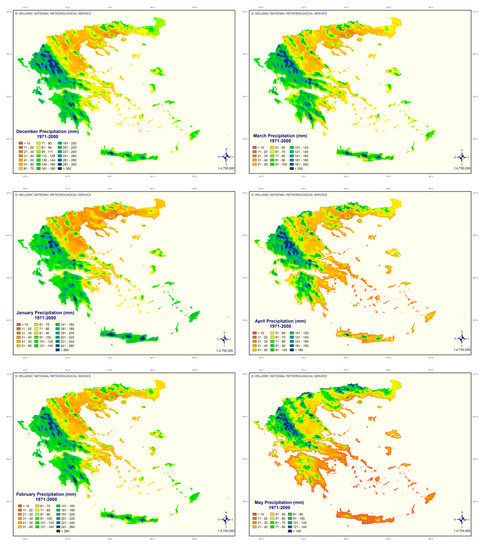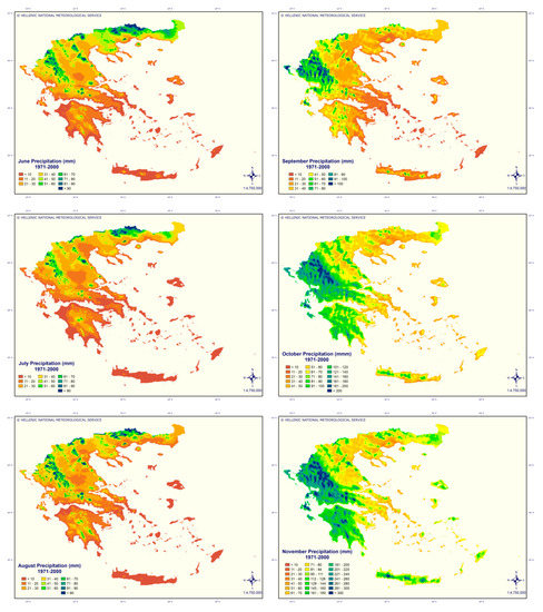 The maximum mean monthly precipitation amount exceeds 300 mm and occurs in November and December, due to the increase of cyclonic tracks in the region [41]. During these months, precipitation peaks at the highest altitudes of the Pindos mountain chain, of the central Peloponnese, and of the Cretan mountain chains. It should be noted that precipitation is higher in November than in December in the Ionian Islands and over major parts of the mainland (e.g., Epirus, Thessaly, and Western and Central Macedonia). During these two months, the lowest mean monthly precipitation amount ranges between 21 and 30 mm in November, mainly on the plain of Serres (Northeastern Macedonia), and in December, again on the plain of Serres but also on the plains of Western Macedonia.