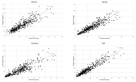 The first step in evaluating the results involved producing seasonal scatter plots of observed and modelled station values (Figure 12). An ideal cross-validation scatter plot should give the points plotted along a 45° line where the axes are the measured and predicted values. In practice, the predicted values differ from the observed values and several errors of prediction can be calculated from the residuals. The charts in Figure 12 illustrate a positive correlation for all seasons with quite evenly distributed patterns. The values of the coefficient of determination (r2) reveal that fall and spring are the seasons that exhibit the best fit to the regression line, indicating that these are the seasons with more correlated data sets, compared to summer and winter with the slightly reduced correlation results. Monthly values of r2 are presented in Table 2, which reveal that May and April are the months with the best correlations while March and January are the least well correlated.