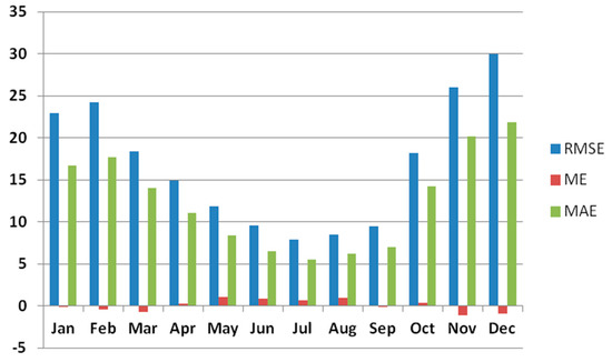 As indicated in Table 2, errors are on the same order of magnitude for all monthly and annual values (RMSE from 19.66% to 36.18%, ME from −0.84 to 3.85% and MAE from 15.26% to 25.38%), while larger errors exist in summer due to the very small rainfall amounts recorded during this dry period. A consistent overestimation of precipitation, as indicated by the positive values of the ME, occurs in summer, while the opposite trend is apparent during the winter (Figure 13). The very low overall values of ME, compared to much higher percentages of MAE, are a sign of the fact that there is not a homogeneous trend in station errors, so values of ME with different signs lead to low values when they are averaged. RMSE values provide the magnitude of the mean error of the interpolation method, which are higher during the fall months.