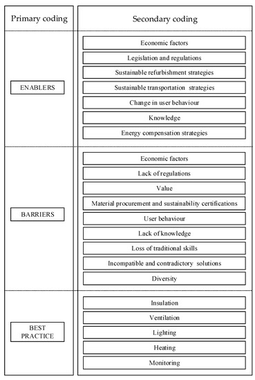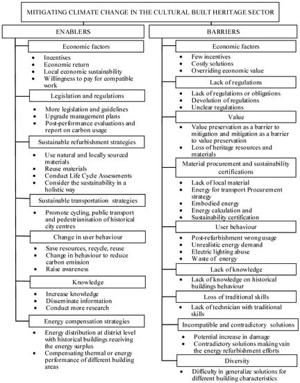 The investigation first examined the interviewees’ perceptions to identify the factors that enable and those that act as barriers to climate change mitigation in the cultural built heritage sector. During the interviews, the participants addressed issues such as reducing carbon emissions and the transition to a low carbon economy, improvements in the energy performance of historical buildings, the preservation of heritage values, the sustainability of materials and methods used for refurbishing and restoring heritage assets.