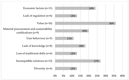 In addition to the factors found to enable climate change mitigation in the cultural built heritage sector, the interviewees also identified a number of barriers. These barriers were grouped into nine themes: ‘economic factors’, ‘lack of regulation’, ‘value’, ‘material procurement and sustainability certification’, ‘user behaviour’, ‘loss of traditional skills’, ‘lack of knowledge’, ‘incompatible solutions’ and ‘diversity’. Figure 4 shows the number of interviewees mentioning each of the identified enablers as well as their percentages. Eleven interviewees, i.e., the 24% of the total number of interviewees, mentioned ‘economic factors’ as a barrier to climate change mitigation in cultural heritage sector. Table 3 provides examples of quotes from the interviewees in relation to each enabling factor.