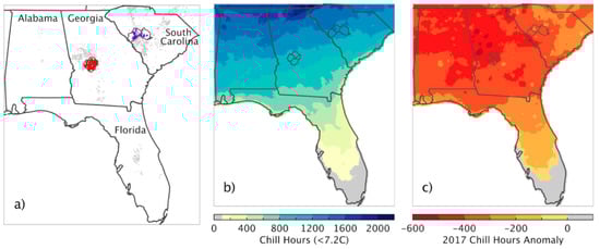 The peach industry in the southeastern United States (SEUS) has been a part of the regional iconography since at least the mid-1920s, and was historically an important part of the agricultural economy [1]. While California’s current peach production dwarfs that of Georgia and South Carolina [2], the industry in the SEUS continues to contribute millions to regional, state, and local economies [3], and peaches remain important to regional identity [1]. In 2017, approximately 80% of Georgia’s peach crop and 90% of South Carolina’s peach crop were damaged due to warm winter temperatures. The warm conditions resulted in insufficient winter chill accumulation in some areas, while other parts of the SEUS were impacted when an early bloom, due to unseasonably warm temperatures, was followed by a mid-March freeze. In Georgia, an estimated 70% of the total 2017 peach losses were attributed to inadequate chill and 10–15% of the losses, the result of a spring freeze [4]. The combined impacts of anomalously low chill accumulation and spring freeze yielded substantial economic damage across the region [5]. Given the role of the peach industry in both the economy and culture of the SEUS, the 2017 crop failure garnered much public interest including whether such warm winters and impacts to perennial agriculture may become more commonplace in the coming decades.