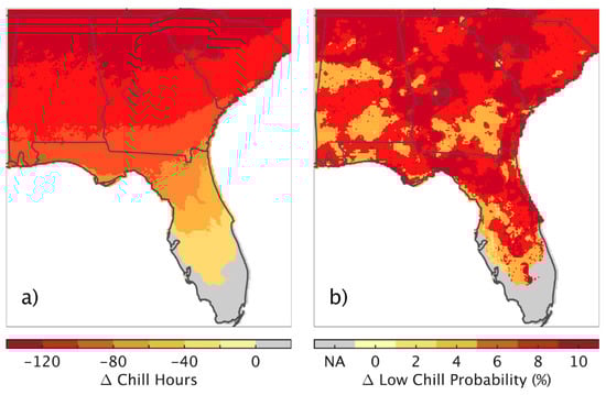 The observed average chill accumulation over 1981–2017 was less than that modeled in the absence of anthropogenic climate change, consistent with the expectations from modeled warming (Figure 2a). A distinct geographic pattern of the reduced chill hours due to climate change was evident across the SEUS, with nominal differences in southern Florida and reductions of more than 120 h in northern Alabama, Georgia and South Carolina. The peach-growing regions showed average reductions of ~115–120 chill hours in Georgia and South Carolina. Notably, these reductions are averages over the 37-year period as the modeled estimate was larger in more recent years. Complementary to average reductions in chill hours, the percent of years experiencing low winter chill was substantially higher across the SEUS over the 1981–2017 period than it would have been in the absence of climate change (Figure 2b). These trends were found across models. The 23-model range for declines in chill was ~68–140 h, while the range for the probability of low-chill winters was 1.6–4.6% of years (from a reference of 10% of years).