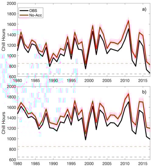 Time series of 1981–2017 chill accumulation for (a) the Georgia peach-growing region, and (b) the South Carolina peach-growing region. The observed data (OBS) are shown in black, while modeled chill accumulation estimates excluding the influence of anthropogenic climate change (No-Acc) are shown in red, with lighter red lines indicating individual models and the heavy red line indicating the 23-model median. The light pink dashed line indicates the chill requirement for a high-chill peach cultivar and the dashed grey line indicates the chill requirement for a moderate-chill peach cultivar.