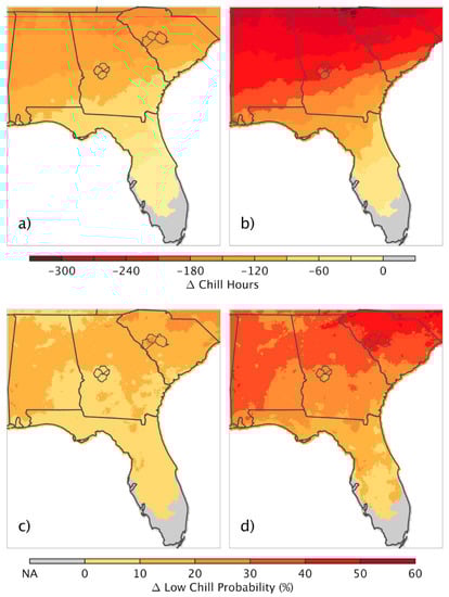 The reduced chill accumulation across the SEUS was modeled relative to contemporary 1981–2017 averages for the early and mid-21st centuries, with multi-model mean SEUS declines of ~100 h, and ~185 h, respectively (Figure 4a,b). The geographic patterns of reductions in chill hours were similar to those shown for the influence of modeled climate change for the 1981–2017 period. Over Georgia (South Carolina) peach-growing regions, the average declines in chill were calculated as ~110 (~135) hours by the early 21st century and ~210 (~250) hours by the mid-21st century. In addition to declines in the average chill accumulation, the probability of experiencing a year with low winter chill accumulation increased. Averaged across the SEUS and across all models, approximately 20% of years by the early 21st century and 40% of years by the mid-21st century experienced low winter chill, with the greatest increases across western and northern Alabama, northern and central Georgia, and northern and central South Carolina (Figure 4c,d). By the early and mid- 21st century, Georgia (South Carolina) peach regions saw ~15% (30%) and 32% (52%) of years having low winter chill, respectively.