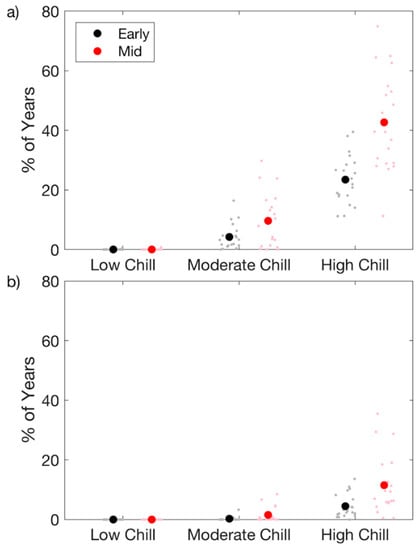 (a) For the Georgia peach-growing region, the percent of years with insufficient chill for a low-, moderate-, and high-chill peach cultivar under early 21st (black/grey) and mid-21st (red/pink) century conditions. Small grey and pink dots indicate the percent years for individual models, while the larger black and red dots indicate the 20-model average (b) As in (a) but for the South Carolina peach-growing region.