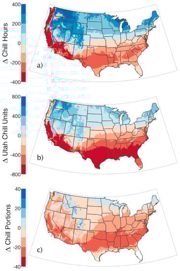 The 20-model average difference in annual accumulated chill between the modeled historical period (1971–2000) and the mid-century (2040–2069) period under RCP 4.5, where chill was accumulation was calculated over the October 1—April 30 cool season using (a) the Modified Chill Hour Model as chill hours 32–45 °C, (b) the Utah Model as chill units, and (c) the Dynamic Model as chill portions. The red shades indicate a reduction in chill accumulation under RCP 4.5, while the blue shades indicate an increase in chill accumulation. The white regions in (c) indicate areas with no chill accumulation under historical conditions. These data can be viewed and downloaded from the Climate Toolbox (https://climatetoolbox.org/) at (a) https://bit.ly/2QjbT2l (b) https://bit.ly/2AtEpZI and (c) https://bit.ly/2SBDcqm.