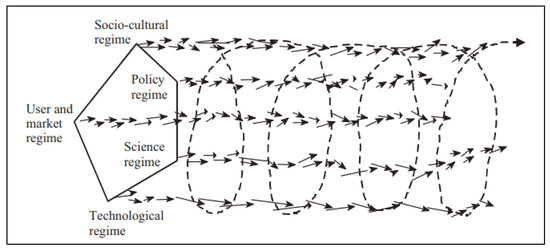 Changes leading to energy transition occur in a complex socio-technological regime simultaneously in five dimensions: socio-cultural, policy, science, technology, user, and market (Figure 1). A broad partnership of actors is supposed to be important in the realization of such projects. As Elbe et al. stress, value-added partnerships integrating economic, government, and non-governmental organization (NGO) sides are proper ways of renewable energy-based project planning and implementation [24]. With this multi-partner angle, there is a possibility to integrate bottom-up and top-down approaches [25].