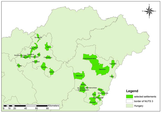 The research was implemented in two NUTS 3 spatial units in Hungary—Heves and Hajdú-Bihar counties—where a total of 29 settlements with diverse socio-economic conditions were examined (Figure 2). Among them, two cities with county rights—cities that exercise the rights of a county within its boundaries—were picked. In general, they have the best material background as well. Some of them were small towns with fewer rights, and the majority comprised small villages with the least administrative power and minor financial resources.