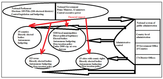 The study area represents the main attraction zones of the two universities. They belong to the North Hungarian and the North Great Plain Regions. Although both regions belong to the least developed areas of Hungary, there are some more advanced urban zones (Debrecen and Eger) as well, where the socio-economic development level is above the national average. Concerning the population, information technology (IT) accessibility, education level, and employment conditions, the chosen settlements are diverse in order to represent the national situation. In the Hungarian system of governance, municipalities, as legitimate units, have elected bodies, may tax local activities, and can arrange local public affairs autonomously. Bigger towns and cities have almost the same rights—there is no subordinate relationship among them. The 19 Hungarian counties have their municipal bodies, but they have no right to control village or town municipalities. Counties help the government to plan and realize spatial development programs. The national government indirectly controls municipal activities through the system of public administration, but its objectives can be bulldozed directly through financial tools as well (Figure 3).