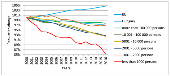 Relative to the year 2000 as the base in population change in the chosen settlements, it can be seen that, in small villages (under 1000 persons), the decrease is drastic (−15%), and in bigger towns (between 1000–100,000 persons), the decrease is significant (−3 to −7%). Decrease is a national trend as well (−3%), while in the European Union, the rate is +5% (Figure 4). Compared with the national rate, the city of Debrecen is in a better situation with a 2% decrease.