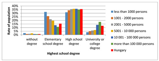 Concerning the level of education (Figure 5), the situation is similar in Hungary. Smaller villages have a higher rate of low-educated persons, and higher education is rare in these settlements.