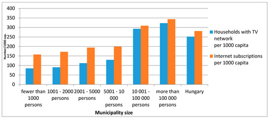 The disadvantage of smaller villages in the case of television and Internet access is prevalent. (Figure 6). While in Hungary, the average number of homes with a television network is 251 per 1000 persons and the average number of Internet connections is 281 per 1000 persons, in settlements with fewer inhabitants, these values are much lower. In villages with fewer than 1000 inhabitants, these values are 81 and 158, respectively, which is a dramatic gap compared to the national average.