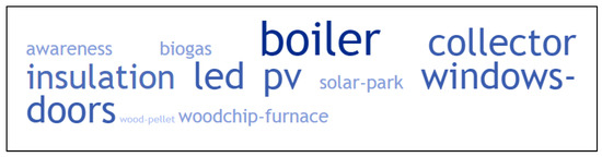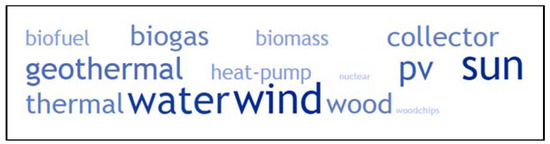 During the interviews, respondents were asked to list things that came to mind about renewable energy sources. A word frequency graph was created from the text of interviews concerning knowledge on renewable energy sources (Figure 7). Solar, water (hydroelectric), and wind were the most familiar ones. It is worth mentioning that, for many interviewed persons, different technological solutions were equal to RES. This might be explained by an over-technologized view of RES issues compared with social, ecological, and governance considerations. Although biomass is one of the most frequently used renewable energy sources in the Hungarian countryside, it is a relatively rarely mentioned type. Presumably, the word itself is rarely used, and this is also proved by the fact that different kinds of biomass are present in the list in high numbers. One can see that even non-renewable nuclear energy was referred to by someone. It can be seen that conceptual frameworks are various and sometimes contradictory and distorted.