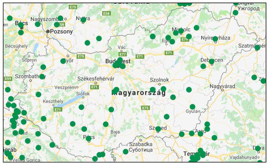 Concerning climate or energy planning, it may be seen that only bigger municipalities handle it as their own duty. On the map, Hungarian municipalities joining the initiative of the Covenant of Mayors are visualized. It is obvious that only a few of them entered this international initiative—unfortunately, just one of them (Debrecen) was included in the research (Figure 8.)