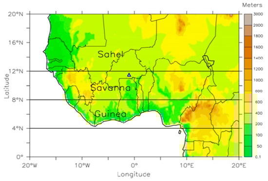 West African topography and the three Food and Agriculture Organizations (FAO)- Agro-ecological zones (AEZs): the Guinea, Savanna, and Sahel zones [25,34].