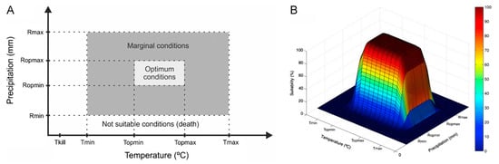 (a) two dimensional and (b) three dimensional diagram describing climate thresholds and its translation into crop suitability (Adapted from [50]).