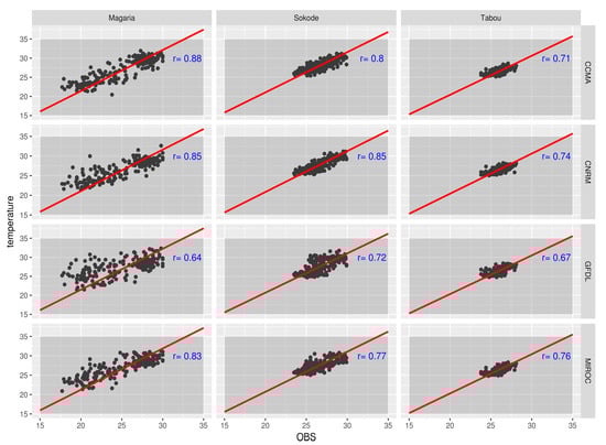 Mean monthly temperature (°C) as depicted by station observations and statistically downscaled CMIP5 GCMs (CCMA, CNRM5, GFDL, and MIROC) across the three agro ecological zones, Tabou, Sokode, and Magaria, of West Africa for the period 1980–2000. The top right corner r-values in each panel represent the correlations between the simulated and observed mean monthly temperature.