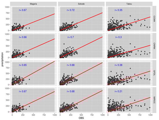Total monthly rainfall (mm/month) as depicted by station observations and statistically downscaled CMIP5 GCMs (CCMA, CNRM5, GFDL, and MIROC) across the three agro ecological zones, Tabou, Sokode, and Magaria, of West Africa for the period 1980–2000. The top right corner r-values in each panel represent the correlations between the simulated and observed mean monthly temperature.