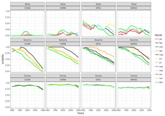 Variability in the suitability of the month of planting for cassava crops in response to both AEZ and time increment is observed across the GCMs (Figure 5). The Guinea AEZ is currently the most suitable AEZ in which to grow cassava and is predicted to remain so. Suitable planting months in the Savanna AEZ as identified by all four models includes April–June and December, however a notable decline is observed, consistent for all four GCMs. Suitability declines from just below 1.0 to below 0.5 by 2050 in most cases. Conditions in the Sahel are presently and remain of low suitability. The simulation of the cassava crop growing season and period of planting across the three AEZs: Guinea (January–July and September–December), Savanna (April–November), and the Sahel (May/June–November) corroborates with previous findings with respect to the planting period and growing season in West Africa [54,55,56].