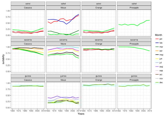 Past climatic conditions (1960–2010) indicate that a crop growth suitability gradient existed from south to north across the three AEZs for each crop type considered. A Suitability Index Value (SIV) (0.75–1.00) is observed for each crop type in the Guinea and Savanna zones throughout the year (Figure 6 and Figure 7). An exception is the cereal crop maize. Maize is marginally suitable (0.25–0.50) in the Guinea AEZ, suitable (0.50–0.75) for planting in May, September, and December in the Savanna AEZ, and January–February in the Sahel AEZ. The suitability increases (0.75–1.00) in 2050 (Figure 6). In the Sahel AEZ, other cereals and mango are suitable (above 0.50). Crop growth suitability increased for pineapple crops in this AEZ.