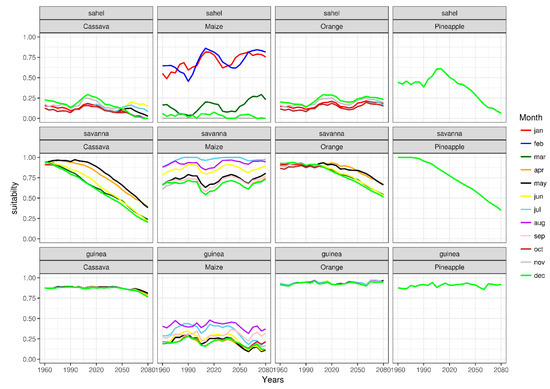 The Ecocrop model is a crop suitability model. It uses a crop growth suitability threshold dataset hosted by the FAO [43]. It is an empirical model originally developed by Hijmans et al. [43] and based on the FAO-Ecocrop database [50] (Figure 2). The computation of optimal, suboptimal, and non-optimal conditions based on these datasets allows for the simulation of the suitability of crops in response to 12-month climate via t-min, t-mean, and prec. [43] (Figure 2). The Ecocrop model evaluates the relative suitability of crops in response to a range of climates including rainfall, temperature, and the growing season for optimal crop growth. A suitability index is generated as follows: 0 < 0.25 (not suitable), 0.25 < 0.5 (marginally suitable), 0.5 < 0.75 (suitable), and 0.75 < (highly suitable) [50,52]. The default Ecocrop parameters were assumed. Although those thresholds may vary with different geographical and/or climatic conditions, previous studies report a close correlation between the Ecocrop model and the climate change impact projections from other crop models [16,27,33,50]. A paucity of data over regions of interest like SSA limits the validation of these processes [53]. Nevertheless, the method contributes to the demand for regional scale assessment of crop response to future climate projections. The 12 coloured lines observed for the Ecocrop climate suitability simulations in Figure 2a,b below represents 12 months. Each describes the most suitable conditions for the crop under consideration in any given month. A highly seasonal crop (e.g., maize) has suitable growth conditions for a limited number of months. The conditions for non-seasonal crops are suitable throughout the year. Crops with a growing cycle longer than a year (e.g., pineapple and plantain) are represented by a single 12-month period.