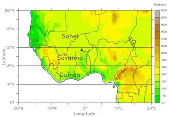 The study area, showing the West African topography and the three Food and Agriculture Organization (FAO) agro-ecological zones, designated as Guinea, Savannah and Sahel, respectively [24,25].